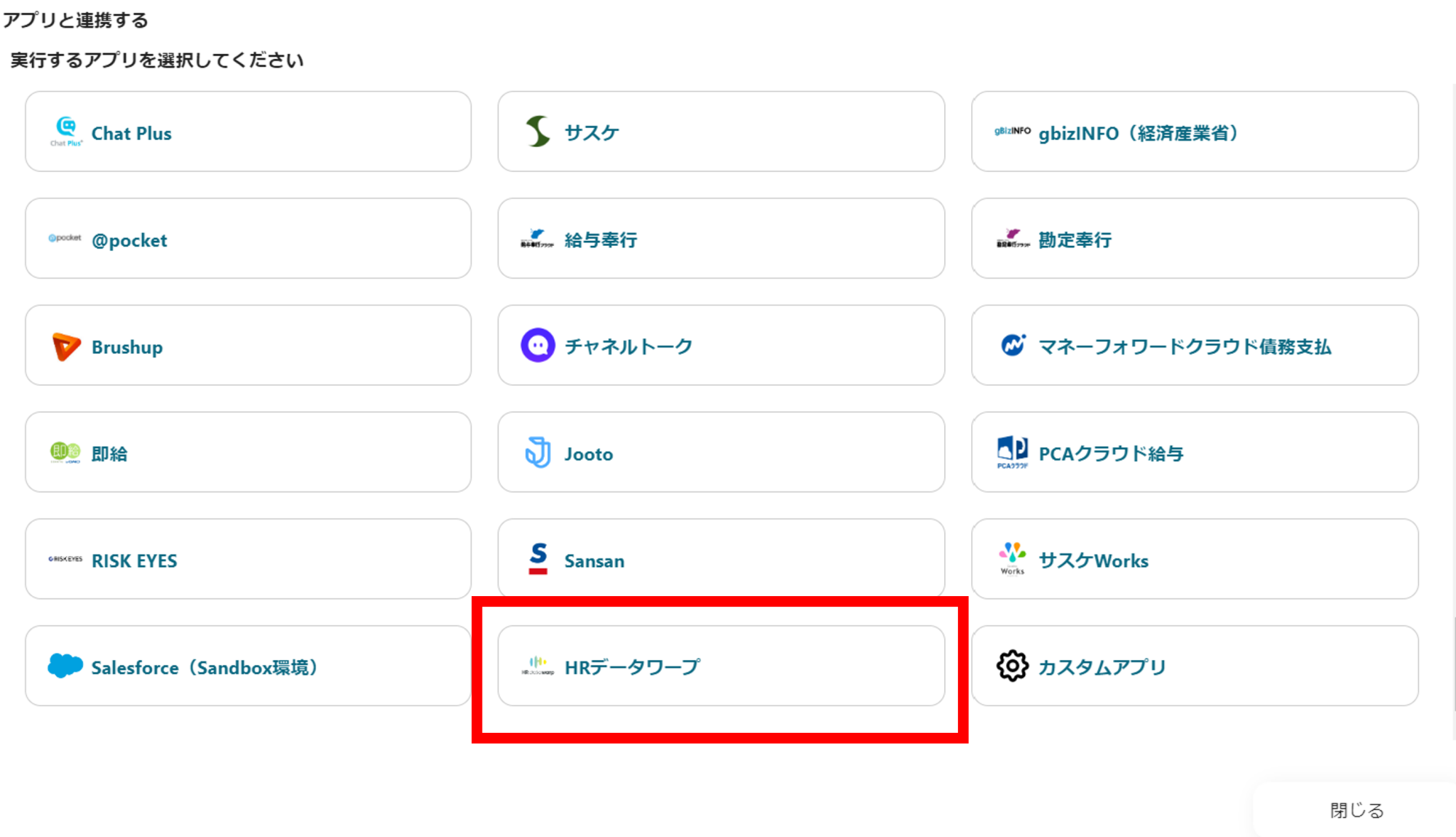 Yoomの連携設定画面にて、HRデータワープを選択していただくことで上記のような自動連携のワークフローを構築していくことが可能です。
